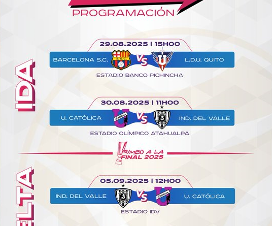 La otra semifinal se jugarรก sรกbado el 30 de agosto de 2025. Universidad Catรณlica recibirรก a Independiente del Valle en el estadio Olรญmpico Atahualpa desde las 11:00 y la revancha serรก el 5 de septiembre en el estadio de Independiente del Valle, desde las 12:00.
