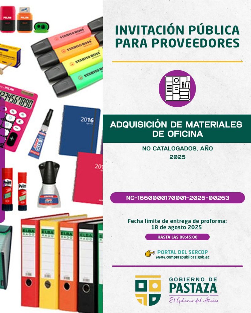 El Gobierno de Pastaza mantiene su compromiso con la transparencia y abre la convocatoria para la Adquisición de materiales de oficina no catalogados, año 2025 ✏️📄📦