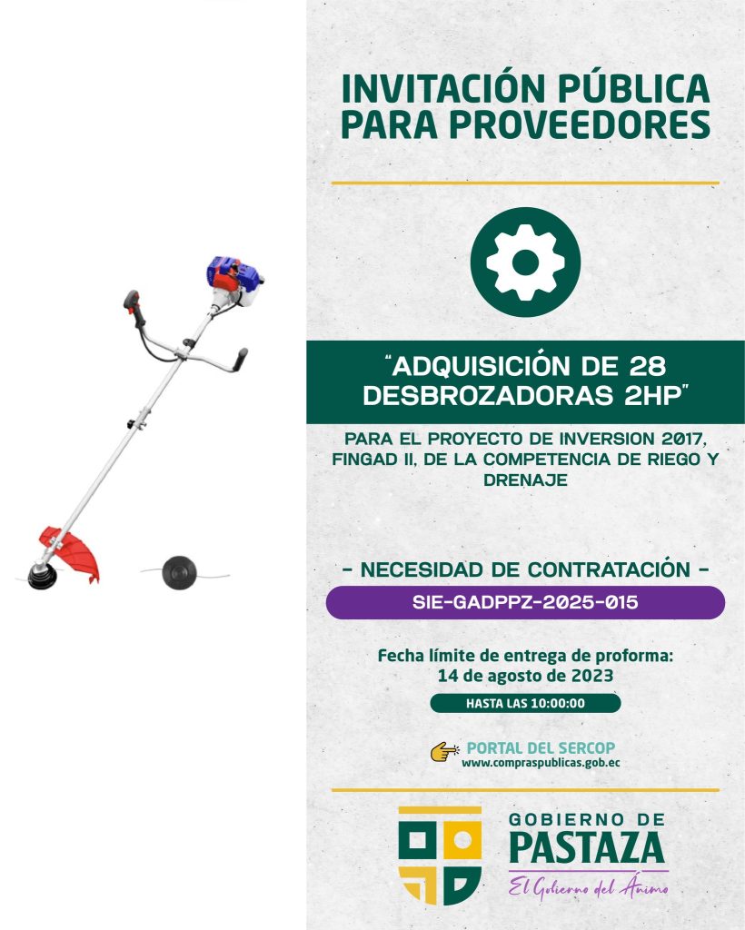ADQUISICIÓN DE 28 DESBROZADORAS 2HP, PARA EL PROYECTO DE INVERSION 2017, FINGAD II, DE LA COMPETENCIA DE RIEGO Y DRENAJE