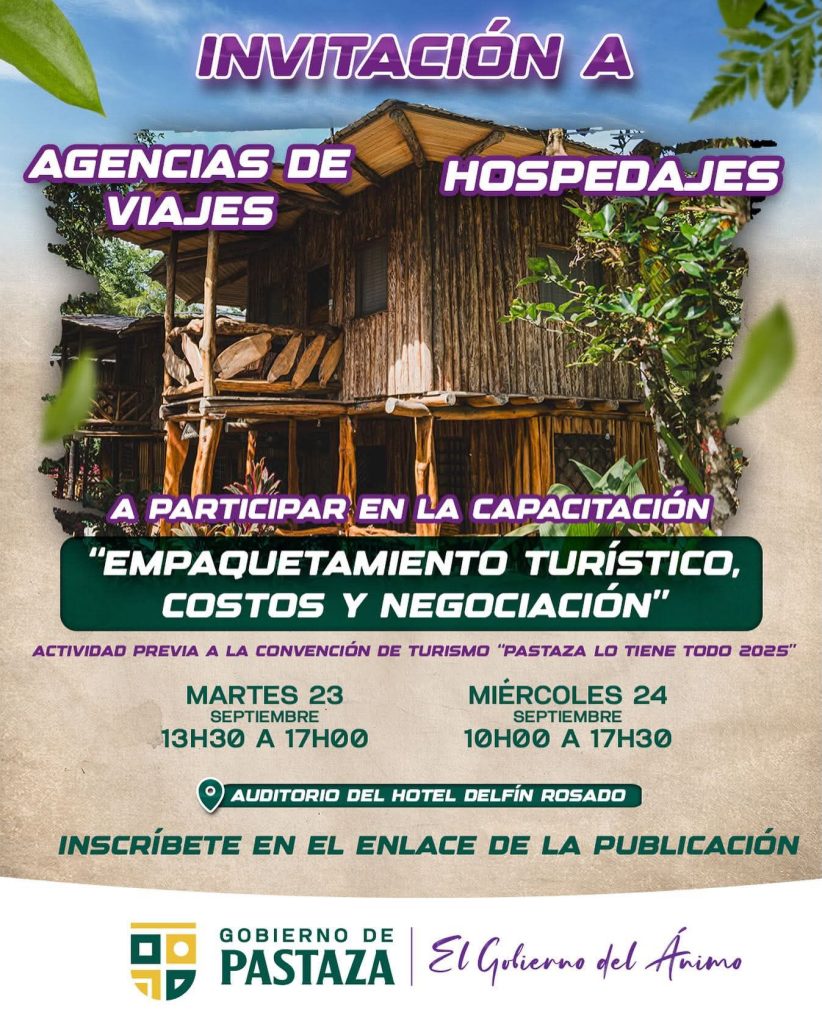 El Gobierno de Pastaza invita a participar en la capacitación “Empaquetamiento Turístico, Costos y Negociación”, dirigida a agencias de viajes y sector de hospedaje.