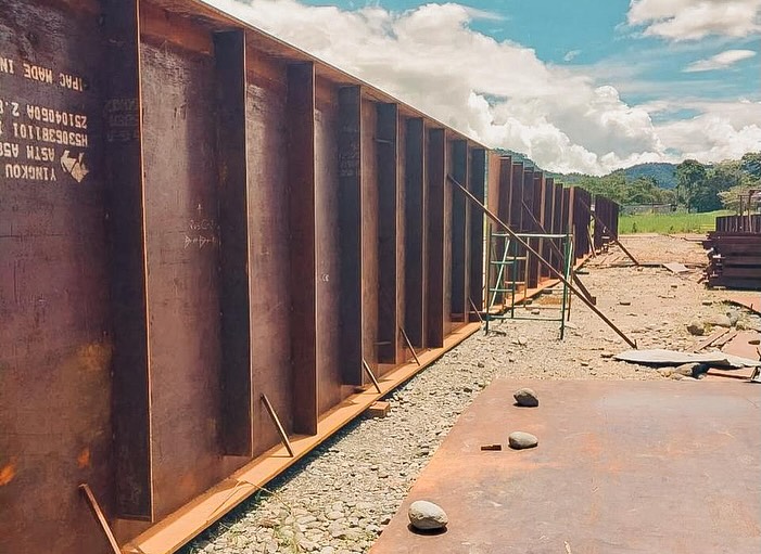 Concluidos los trabajos de cimentación y contención en ambos márgenes del río, actualmente se realizan en taller, labores de soldadura y ensamble de las vigas metálicas, paso previo a su montaje definitivo en el sitio de obra. No nos detenemos !!!