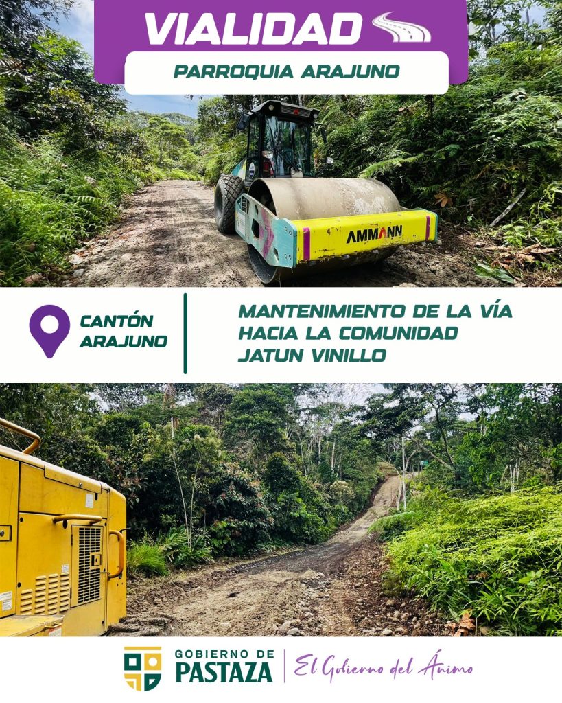 El Gobierno de Pastaza, bajo la gestión del Prefecto André Granda, ejecuta el mantenimiento de la vía hacia la comunidad Jatun Vinillo**, fortaleciendo la movilidad y el desarrollo rural.